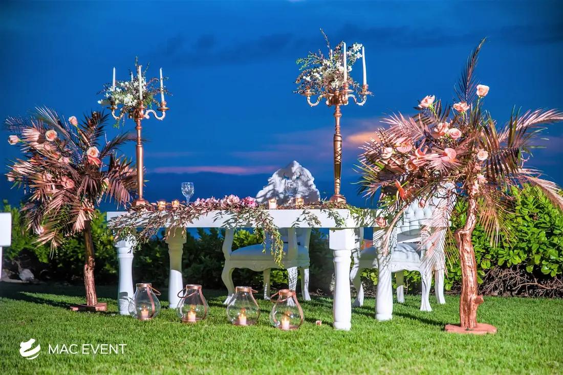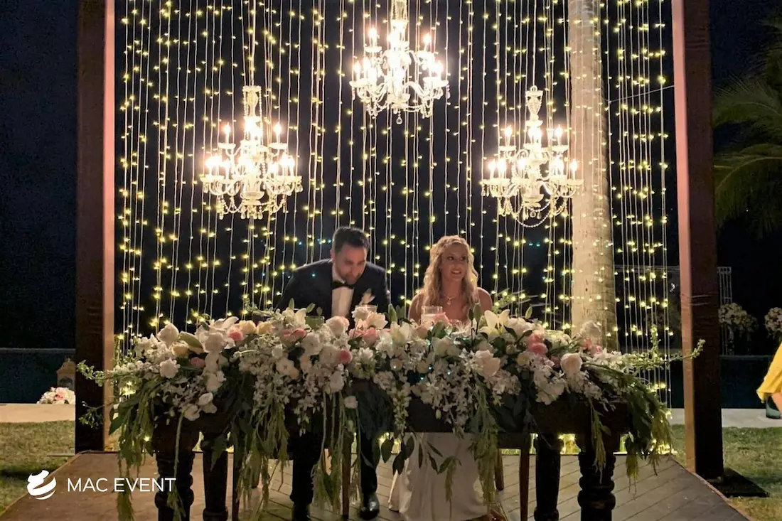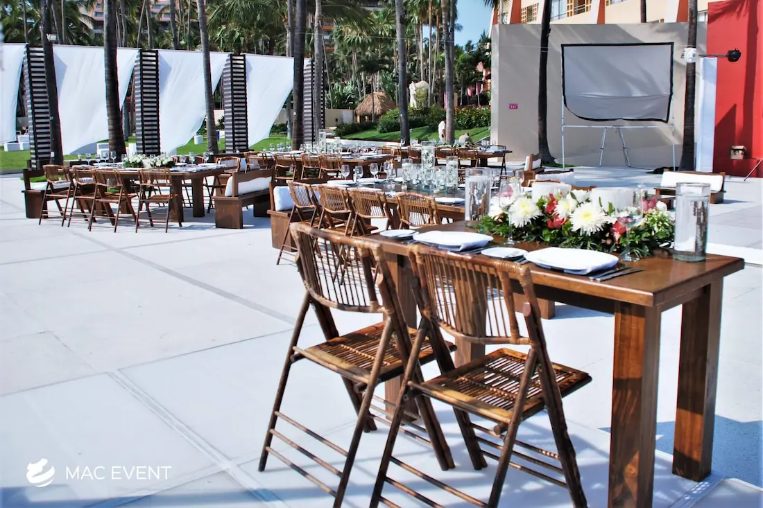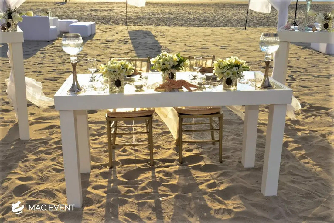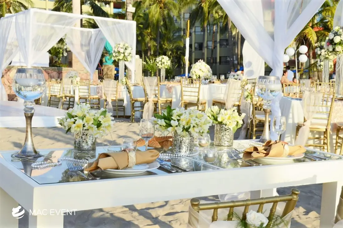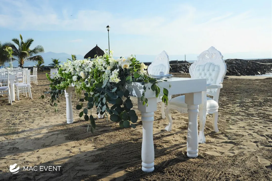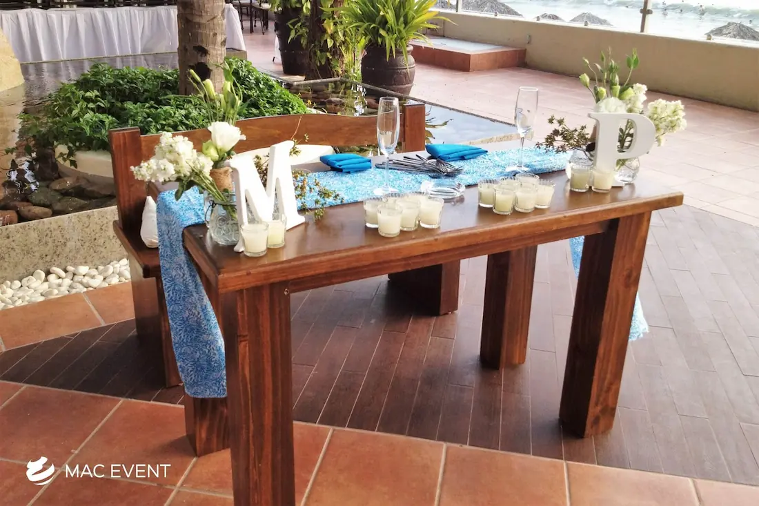 The sweetheart table is a romantic focal point at weddings in Bahia de Banderas, designed exclusively for the newlyweds to share their first moments together as a married couple. This wedding table rental combines elegance and intimacy, often highlighted with floral arrangements, candles, and personalized décor that reflect the couple’s style. Positioned at the center of attention, the sweetheart table enhances both the ambiance and the visual flow of the reception. Renting sweetheart tables in Bahia de Banderas ensures a beautifully coordinated setup that captures the essence of love and celebration. For an elegant and memorable touch, this table is a must-have feature for any wedding.