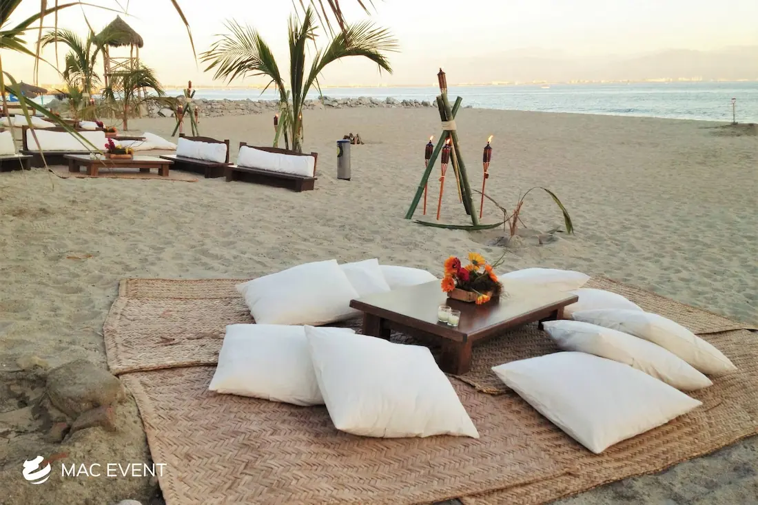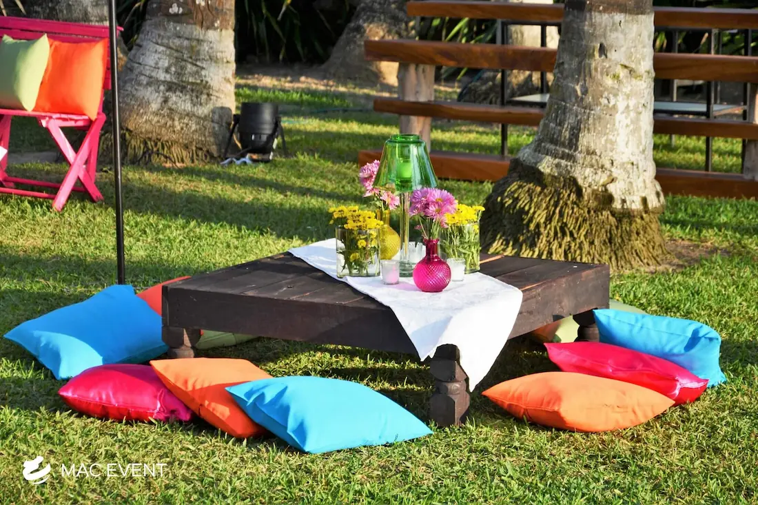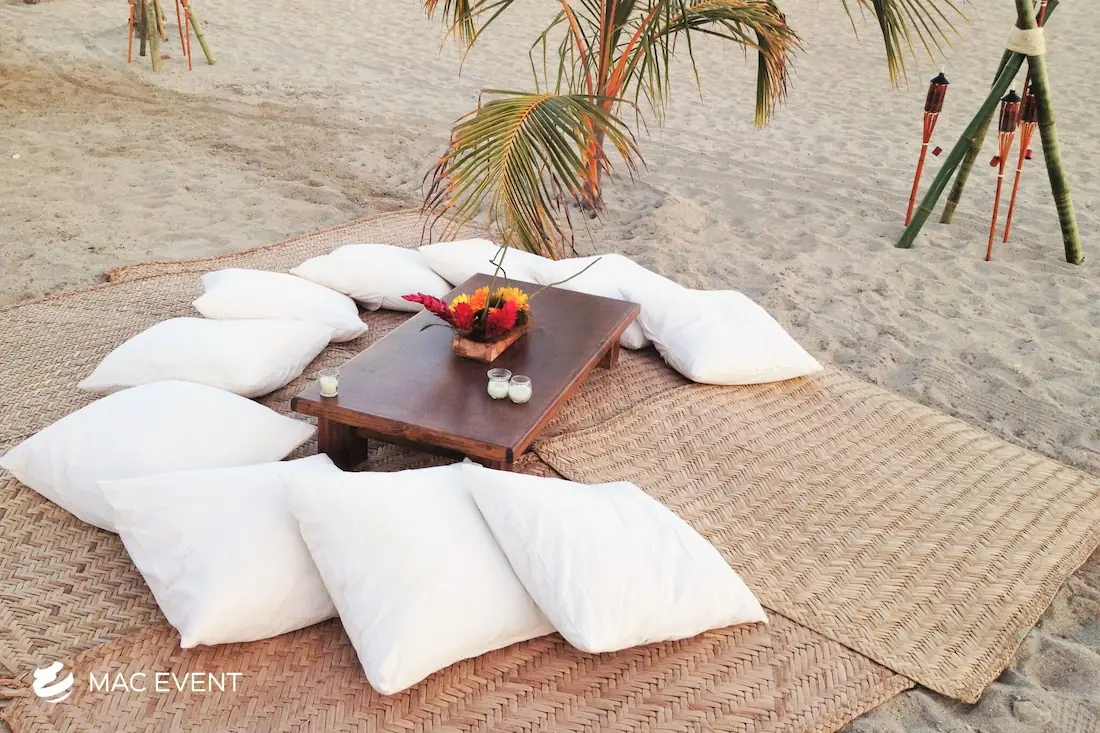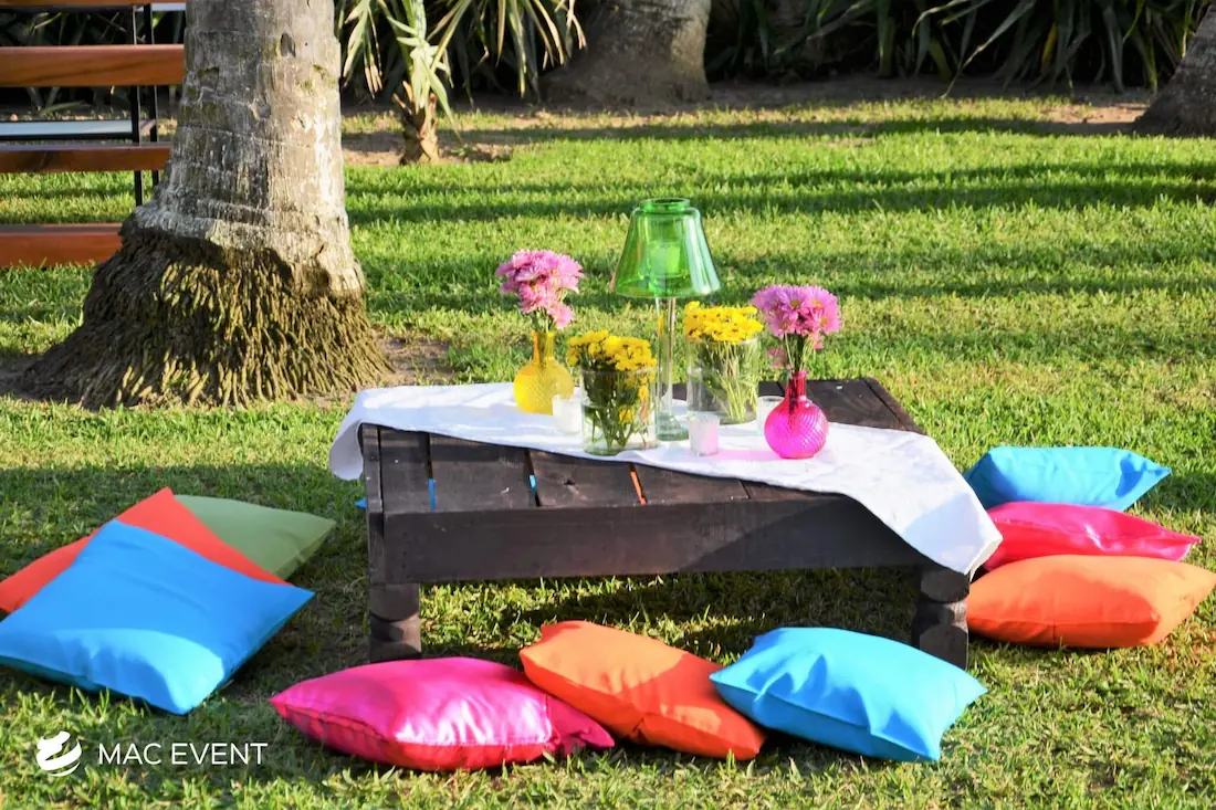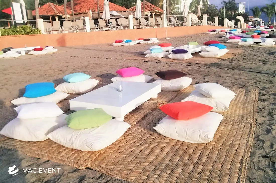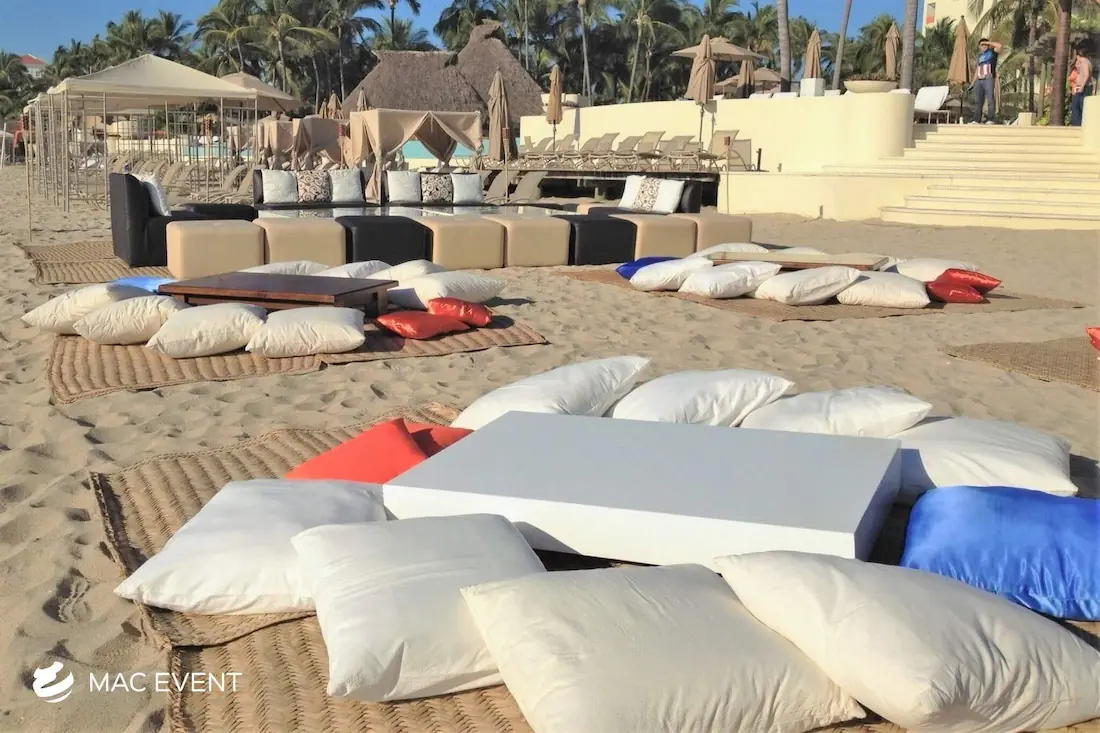 The picnic lounge brings a casual and charming vibe to weddings, beach gatherings, and corporate events in Bahia de Banderas. Designed for comfort and connection, this event lounge rental features low tables, floor pillows, and relaxed seating that create a cozy, outdoor-friendly atmosphere. Perfect for boho themes, tropical celebrations, or family-style setups, the picnic lounge encourages guests to sit back and enjoy the moment. Renting picnic lounges in Bahia de Banderas adds warmth, style, and a touch of creativity to your event décor. For a laid-back yet elegant experience, the picnic lounge is an ideal addition to any celebration.