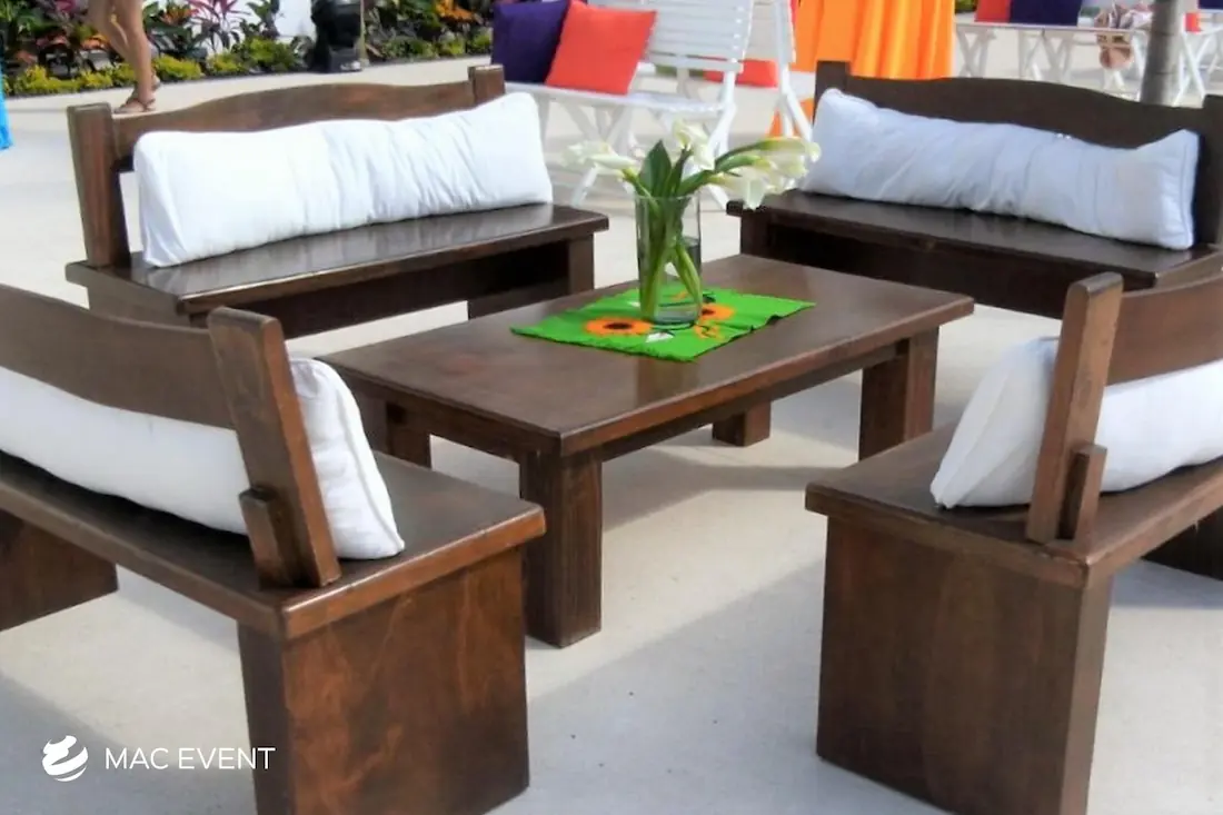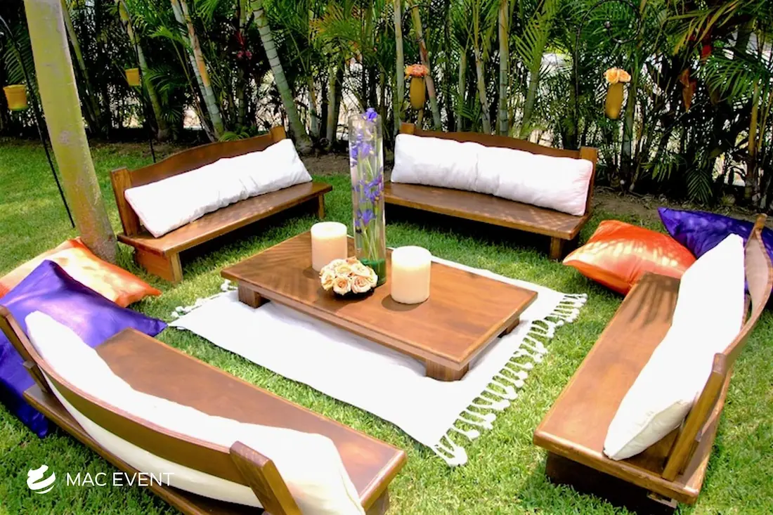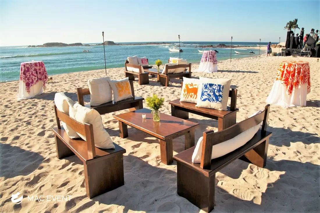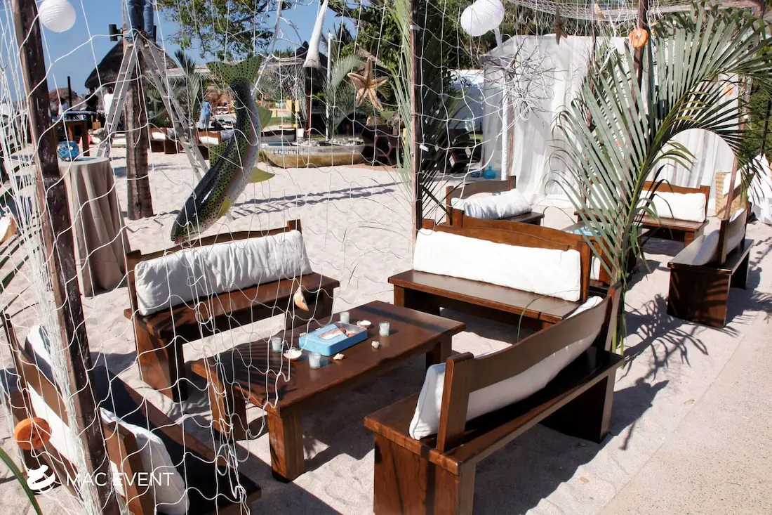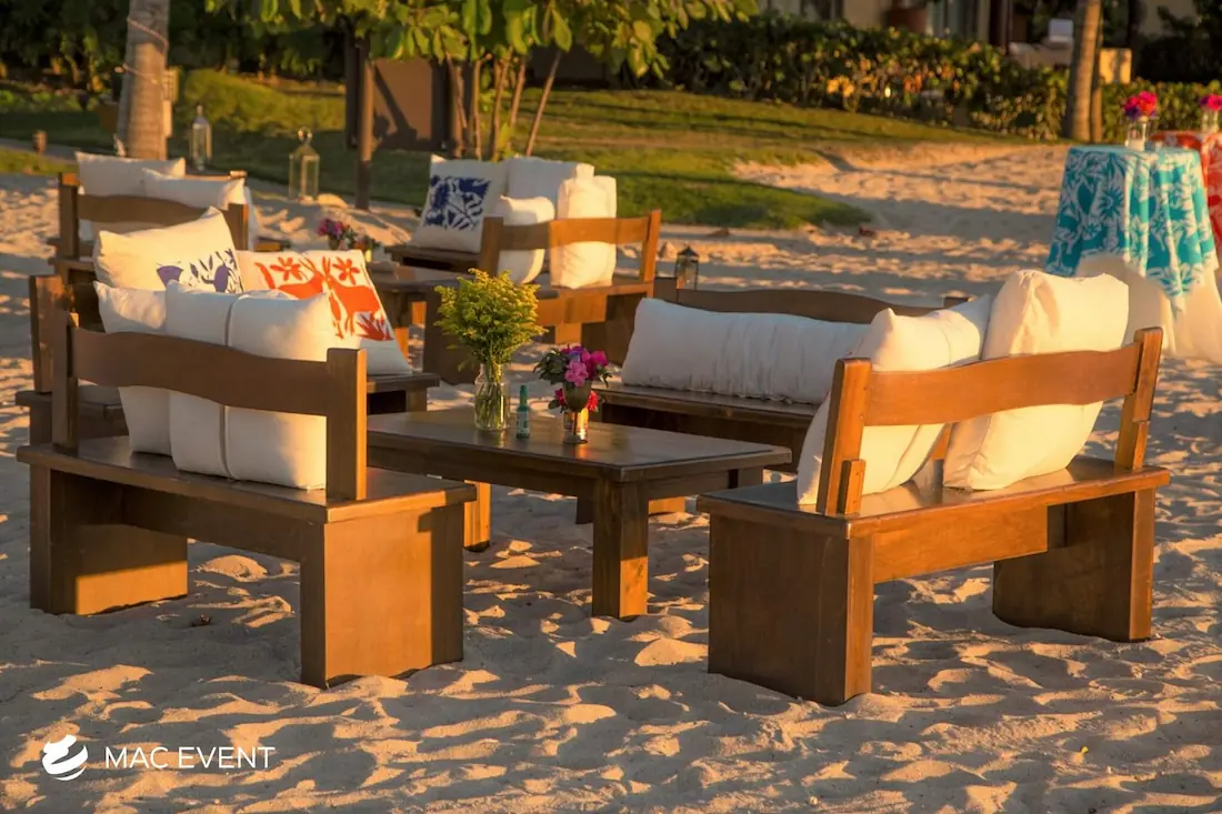 The rustic lounge adds warmth and natural beauty to weddings, beach parties, and corporate events in Bahia de Banderas. With its wooden textures, earthy tones, and cozy design, this event lounge rental creates a relaxed yet elegant atmosphere that complements tropical, boho, or countryside themes. Ideal for outdoor receptions and social areas, the rustic lounge invites guests to unwind and connect in comfort. Renting rustic lounges in Bahia de Banderas allows you to design charming and cohesive spaces that feel authentic and stylish. For a welcoming setup that blends nature and sophistication, the rustic lounge is an excellent choice.